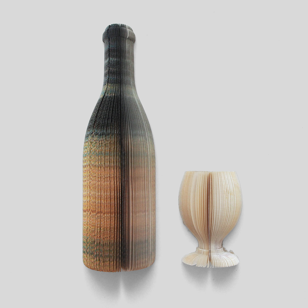 - trimmed paper strips with linen binding that form a glass and a bottle when opened