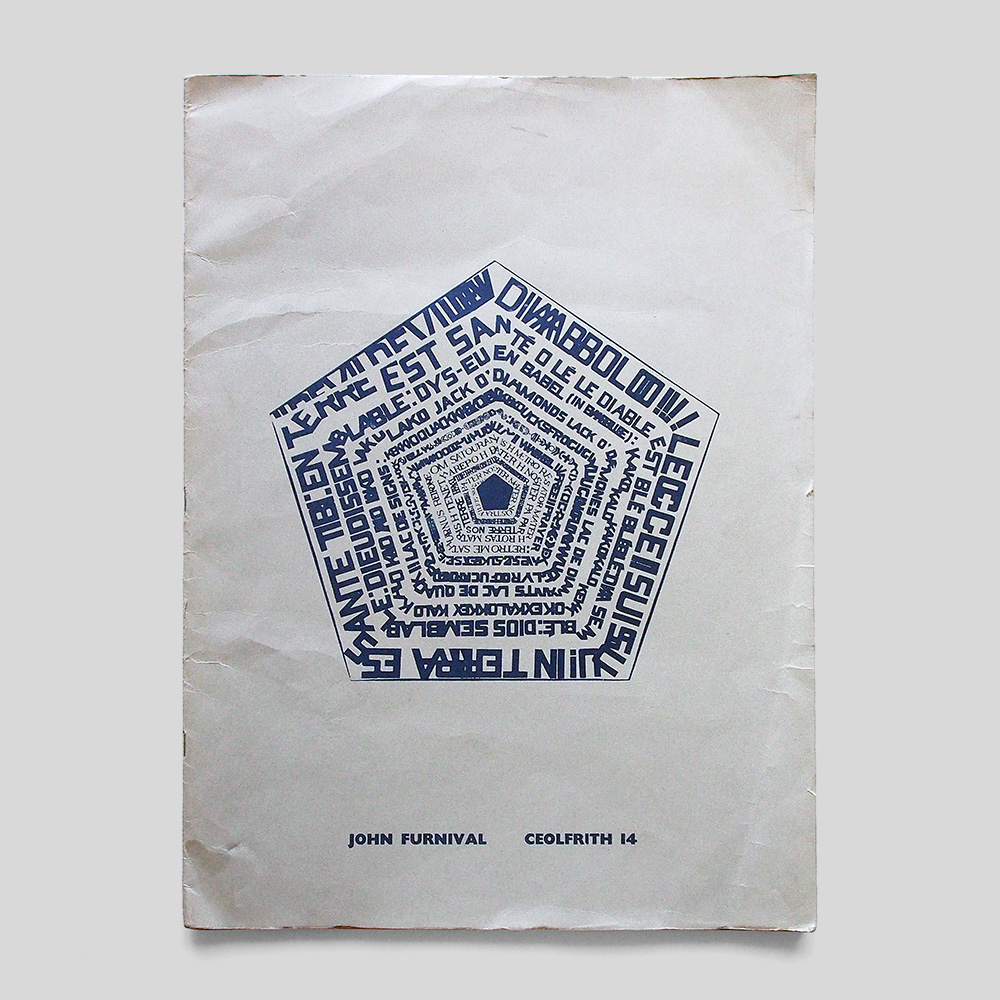 published to mark a retrospective exhibition of John Furnival’s work at the Laing Art Gallery and Annexe in Sunderland, 12 November – 11 December 1971. Contents: Openings Press: An Appreciation and Bibliography, written and compiled by Thomas A. Clark; introduction/interview by Jonathan Williams. Inside the back cover is a pocket containing reproductions of Furnival’s work (in various sizes and colours), including Semi-Idiotic Poem by Ian Hamilton Finlay and Furnival. 13 prints in total. The publication is like a stand-alone mini-exhibition of important Furnival works. Edition of 600 copies. This copy is No.35 of the 50 signed and numbered copies by John Furnival.