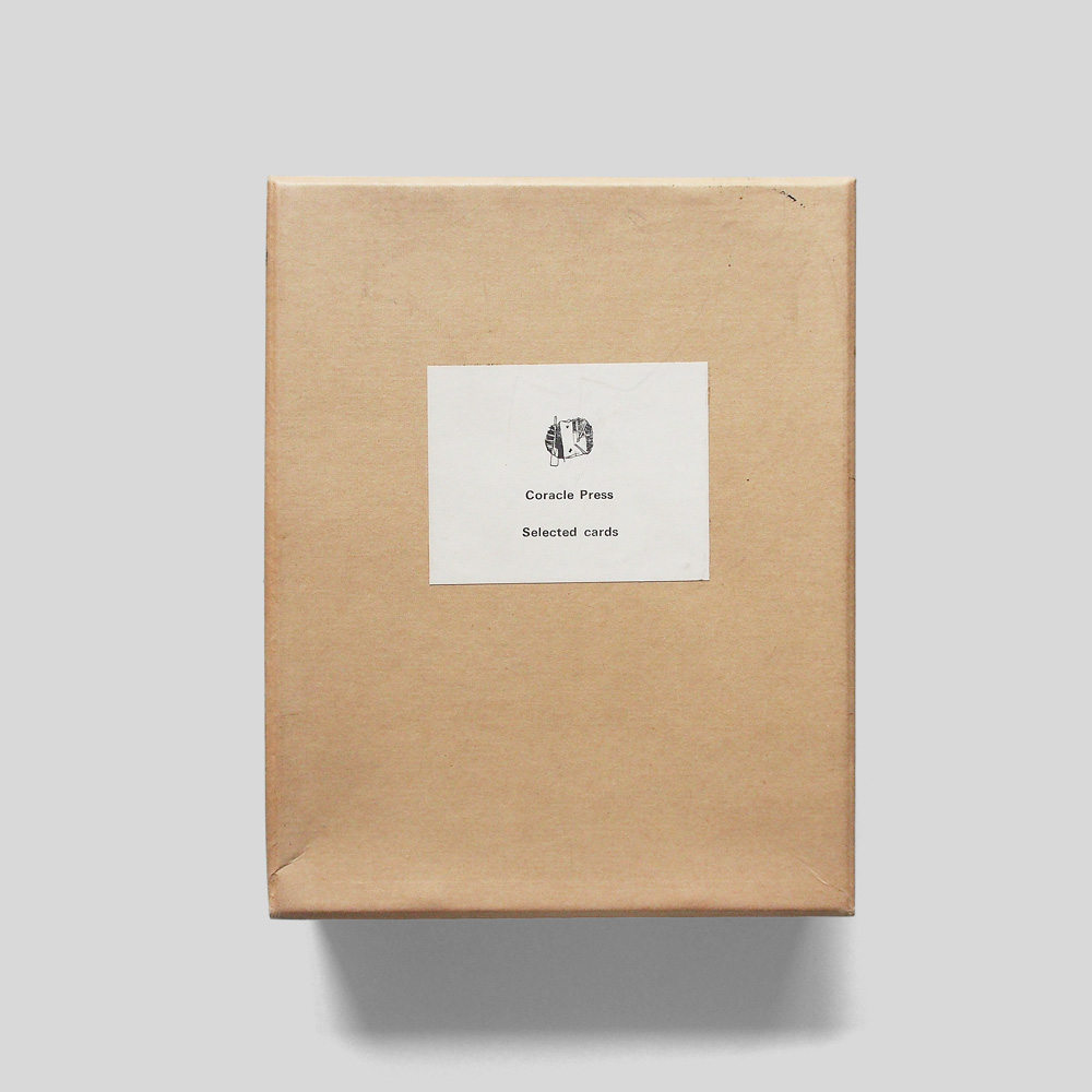 - cardboard box containing two exhibition catalogues and nine pieces of ephemera produced by the Coracle Press.