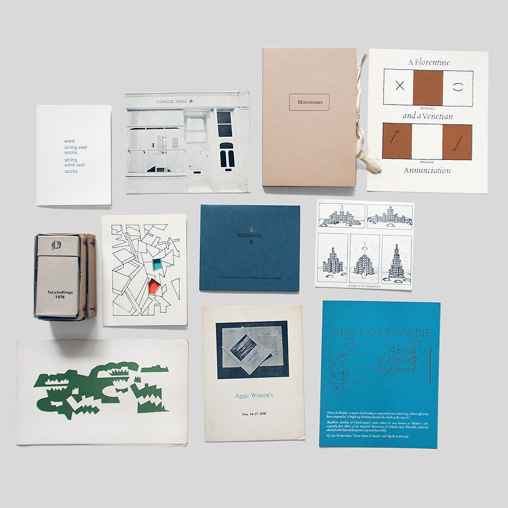Paintings by Martin Fidler (1977); Homage to Eric Mendelsohn by Simon Cutts; Wind, String Vest, Socks (A Coracle Nos.26-30); Aggie Weston’s order card (1978); A Florentine and a Venetian by Stephen Bann; Coracle Press Gallery Subscription card (for 1980); Crescent by David Willets (1976); Tierce De Picardie by Stephen Bann; Winter Topiary by Martin Fidler.