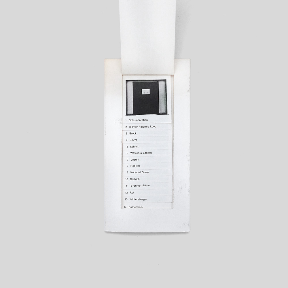 Joseph Beuys, KP Brehmer, Bazon Brock, Hans Joachim Dietrich, Karl Horst Hödicke, Imi Giese, Imi Knoebel, Bernd Lohaus, Konrad Lueg, Blinky Palermo, Sigmar Polke, Gerhard Richter, Gerhard Rühm, Dieter Rot, Reiner Ruthenbeck, Tomas Schmit, Wolf Vostell, Stefan Wewerka, Lambert Maria Wintersberger
