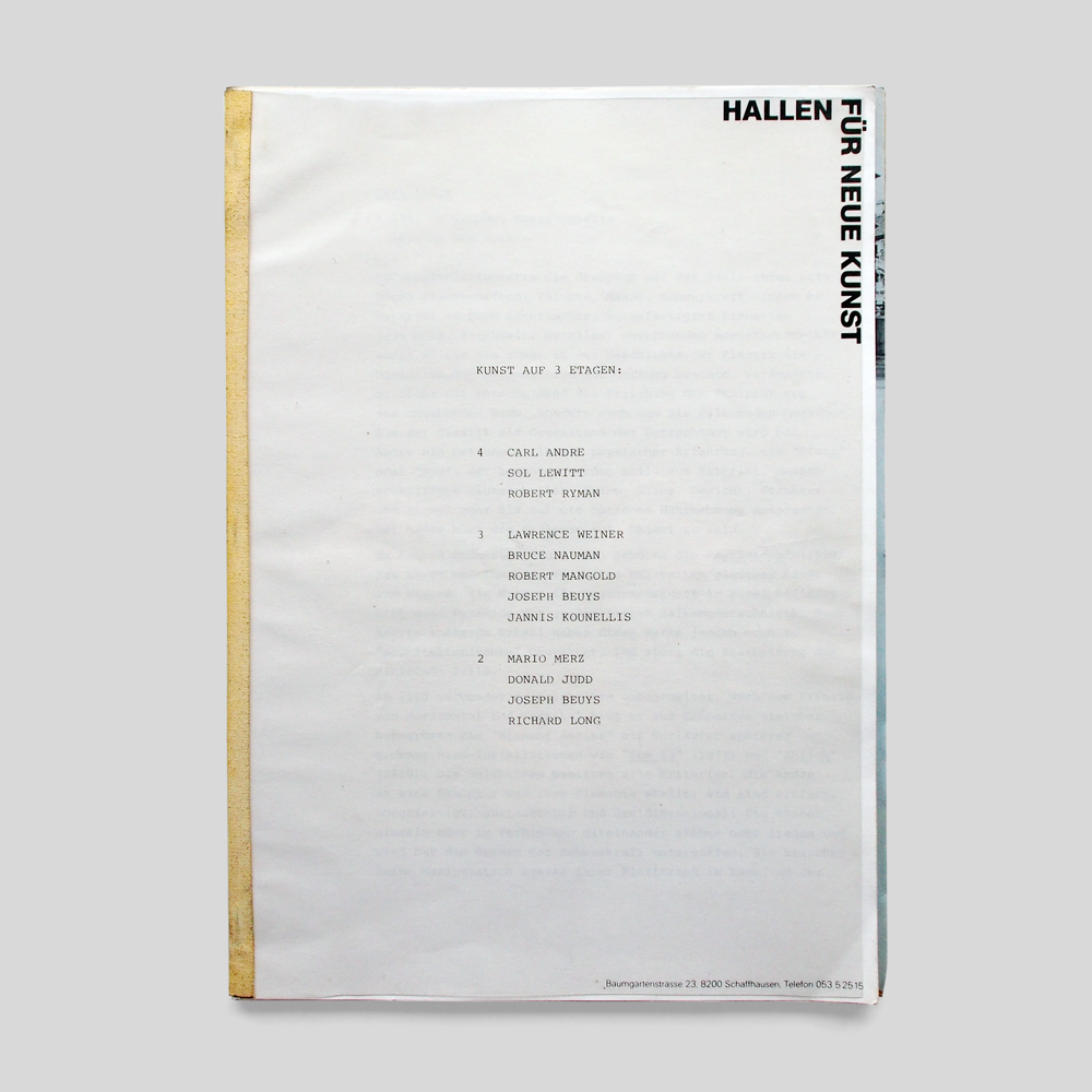 exhibition of works by Carl Andre, Sol LeWitt, Robert Ryman, Lawrence Weiner, Bruce Nauman, Robert Mangold, Jannis Kounellis, Mario Merz, Donald Judd, Joseph Beuys and Richard Long.