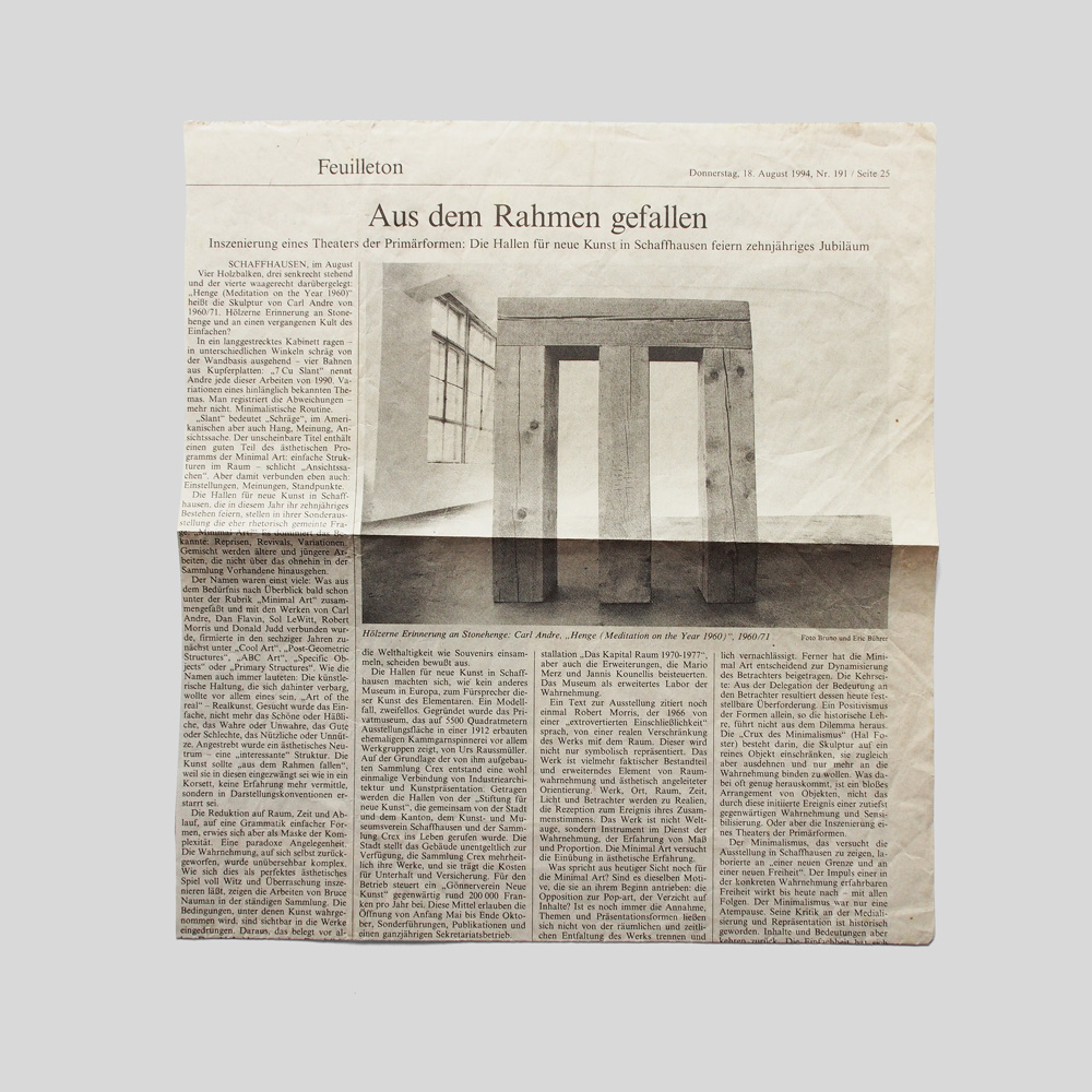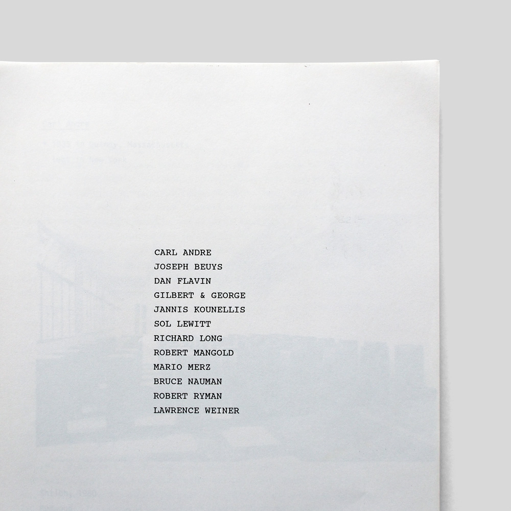 Carl Andre, Joseph Beuys, Dan Flavin, Gilbert & George, Jannis Kounellis, Sol Lewitt, Richard Long, Robert Mangold, Mario Merz, Bruce Nauman, Robert Ryman, Lawrence Weiner