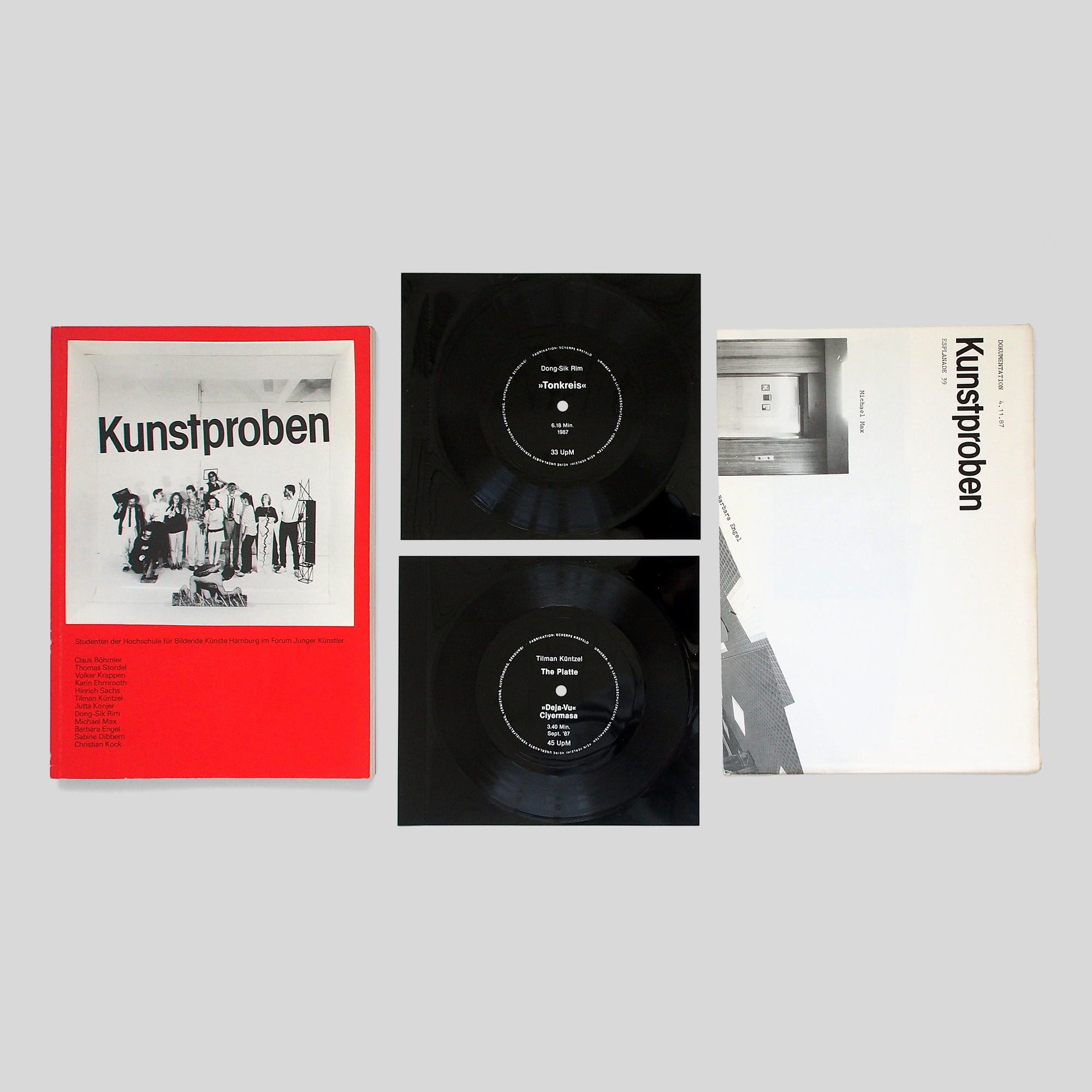 softcover with 2 flex discs(Tilman Küntzel: The Platte and Dong-Sik Rim: Tonkreis) and double-sided printed poster (59 x 42cm): Documentation 4.11.87.