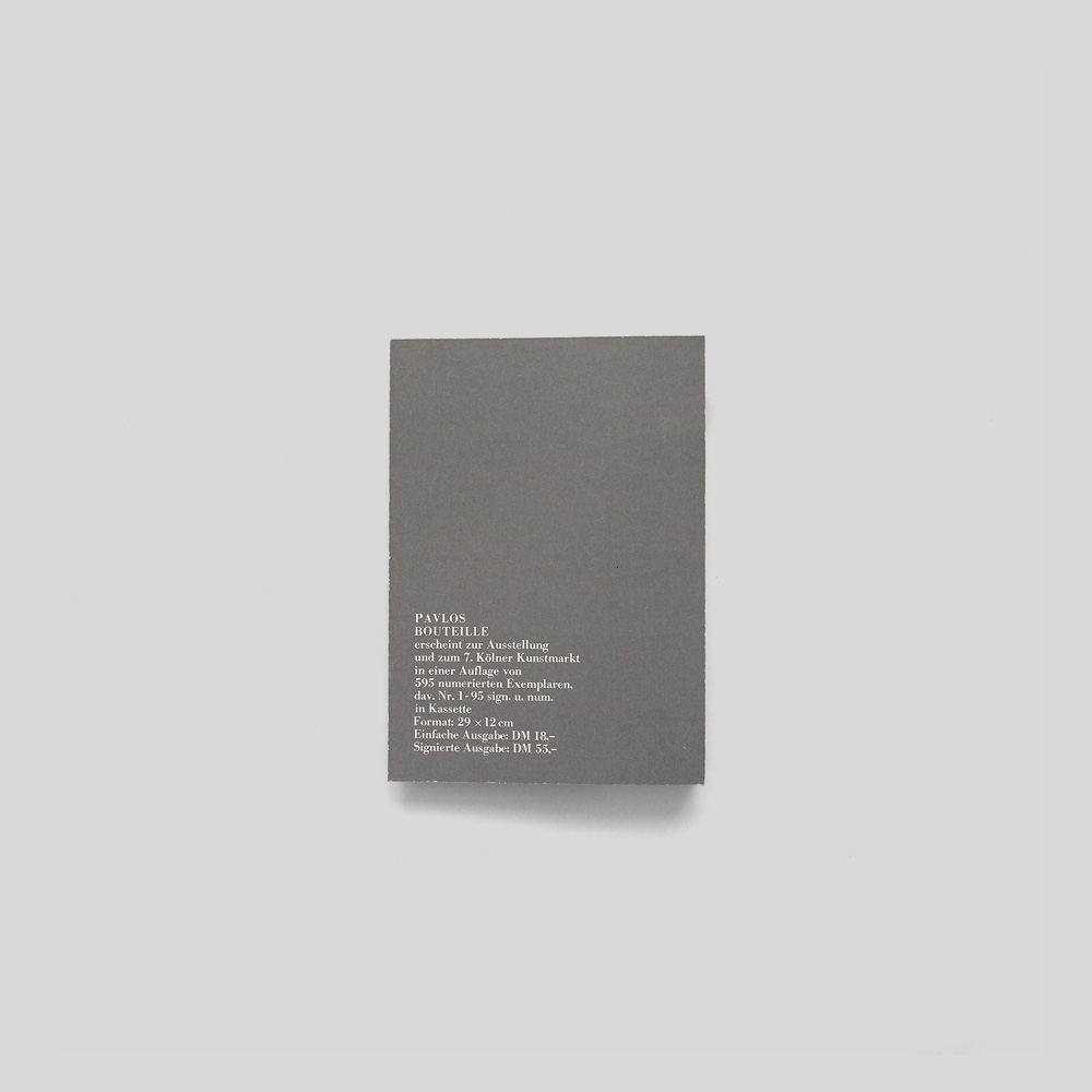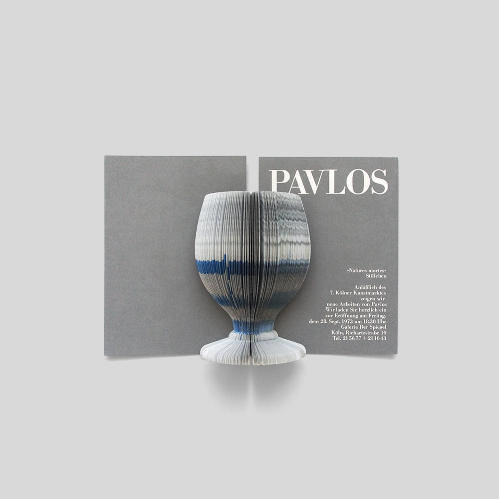 Pop-up invitation card for the exhibition of Greek artist Pavlos Dionyssopoulos and multiple: Bottle and glass. – White and colour-printed, trimmed paper strips with linen binding that form a glass and a bottle when opened.