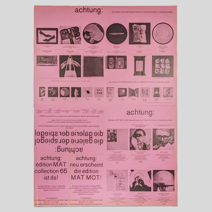 Galerie Der Spiegel, Colonia, 1965 ⁄ folded. exhitibition catalogue. 82 × 60 cm ⁄ design: Karl Gerstner ⁄ - ⁄ Arman, Enrico Baj, Pol Bury, Christo, Roy Lichtenstein, Man Ray, François Morellet, Julio Le Parc, Raphael Soto, Daniel Spoerri, George Brecht, Robert Filliou, Maurice Henry, Dieter Roth, André Thomkins, Emmett Williams