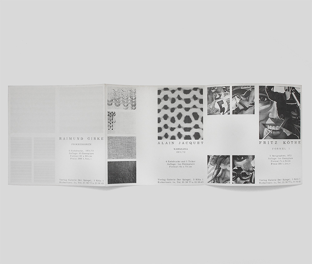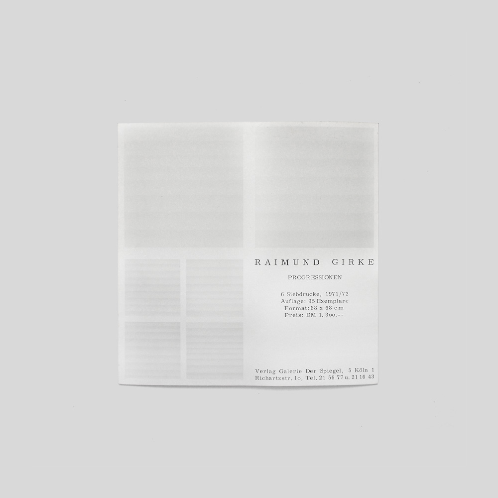 Studio Galerie (Frankfurter Universität), 1967 ⁄ softcover containing six original graphical works (Ewerdt Hilgemann, Charlotte Posenenske, Peter Roehr, Konrad Lueg, Herman de Vries, Kuno Gonschior) ⁄ edition of 500 ⁄ - ⁄ Carl Andre, Arman, Siegfried Baetels, Thomas Bayrle, Ronald Bladen, Hans Breder, Enrico Castellani, Christo, Herman De Vries, Jan Dibbets, May Fasnacht, Eberhard Fiebig, Dan Flavin, Raimund Girke, Hermann Goepfert, Kuno Gonschior, Hans Haacke, Jan Henderikse, Ewerdt Hilgemann, Ewwerdt Hilgemann, Bernhard Höke, Donald Judd, Jiri Kolár, Yayoi Kusama, Walter Leblanc, Kaspar-Thomas Lenk , Sol LeWitt, Konrad Lueg, Adolf Luther, Paul Maenz, Piero Manzoni, Agnes Martin, Almir Mavignier, Henk Peeters, Larry Poons, Charlotte Posenenske, Markus Raetz, Bridget Riley , Peter Roehr, Dieter Rot, Felix Schlenker, Wolfgang Schmidt , Jan J. Schoonhoven, Klaus Staudt, Michael Steiner, Frank Stella, Paul Talman, Günther Uecker, Victor Vasarely, Andy Warhol
