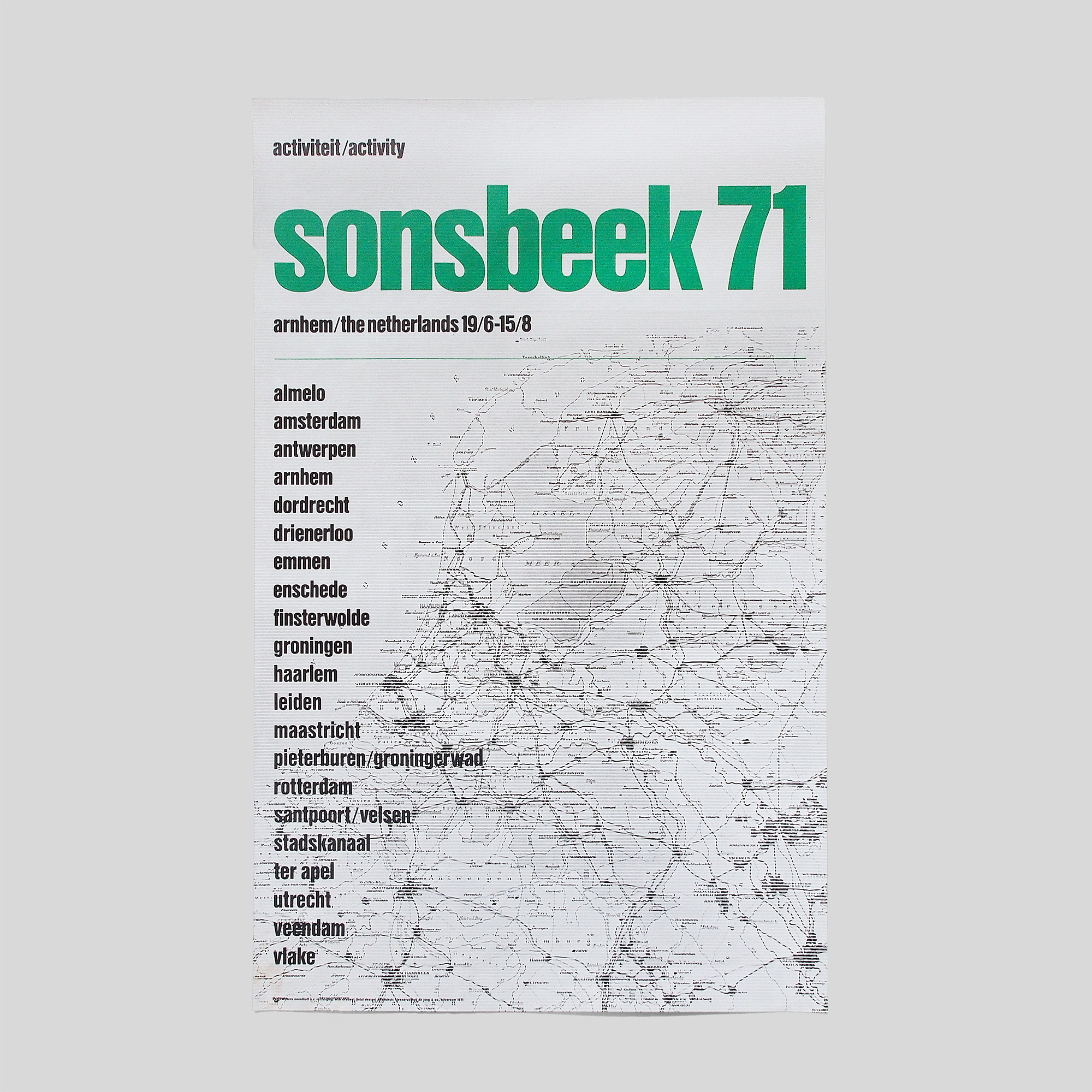 design: Wim Crouwel, Total Design - Vito Acconci, Bas Jan Ader, Carl Andre, Ben d’Armagnac, Richard Artschwager, Bruce Baillie, Douwe Jan Bakker, Joseph Beuys, Ronald Bladen, Marinus Boezem, Stanley Brouwn, Daniel Buren, Javacheff Christo, Tony Conrad, Hanne Darboven, Ad Dekkers, Ger Dekkers, Jan Dibbets, Ger van Elk, Pieter Engels, Groep Enschede, E.R.G., Hans Eijkelboom, Barry Flanagan, Fluxus, Hollis Frampton, Ernie Gehr, Dan Graham, Robert Grosvenor, Mike Heizer, Douglas Huebler, I.C.W., Ken Jacobs, joepat, Donald Judd, On Kawara, W. Knoebel, Hans Koetsier, Axel van der Kraan, Peter Kubelka, George Landow, Standish Dyer Lawder, Sol Lewitt, Richard Long, Walter de Maria, Mass Moving, Yutaka Matsuzawa, Mario Merz, Henri Moore, Robert Morris, Bruce Nauman, Noord-Brabant Groep, Claes Oldenburg, Dennis Oppenheim, Nam June Paik, Panamarenko, Egbert Philips, Emilio Prini, Klaus Rinke, Peter Roehr, Ulrich Rückriem, Edward Ruscha, Fred Sandback, Jean-Michel Sanejouand, Wim T. Schippers, Paul Sharits, Eric Siegel, Tony Smith, Robert Smithson, Richard Serra, Kenneth Snelson, Michael Snow, Koert Stuyf and Ellen Edinoff, Shinkichi Tajiri, Sajiki and Yokoyama Tenjo, Carel Visser, Andre Volten, Hans de Vries, Lex Wechgelaar, Lawrence Weiner, Joyce Wieland. -