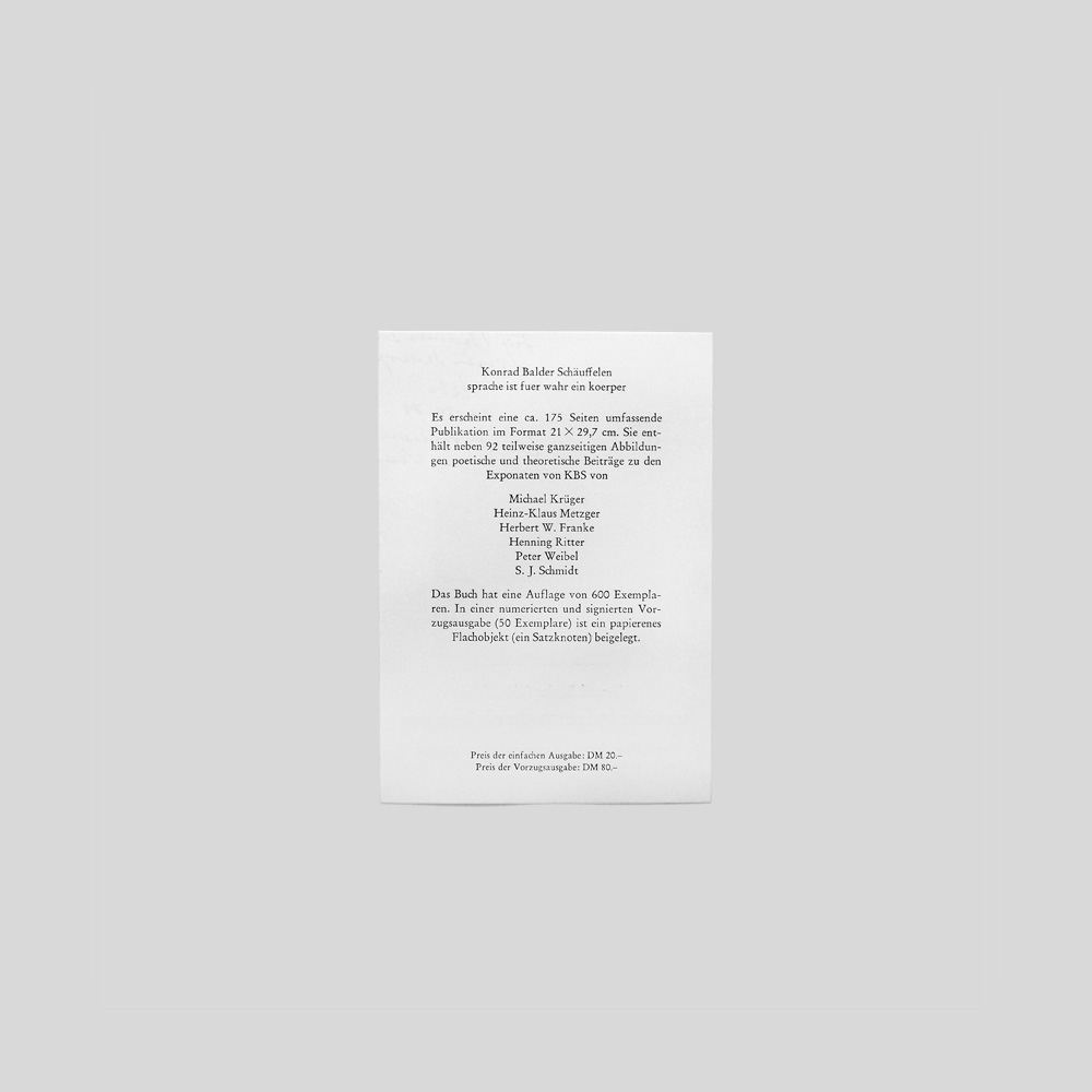 edition rot, Stuttgart, 1966 ⁄ softcover ⁄ edition 550 ⁄ - ⁄ Joe Michaud (usa), Shutaro Mukai (japan), Peter Mardersteig (germany), Ingrid von Oppenheim (germany), Ronald Draper (uk), Hans Amadeus Rosa (switzerland), Elena Asins (spain), Leon Spiro (usa), Yüksel Pazarkaya (turkey), Joaquim Branco (brasil), Kahtan Al-Madfai (iraq, translation: a. el hakim), Carlos Alvear (argentina), Aquiles Branco (brasil)
