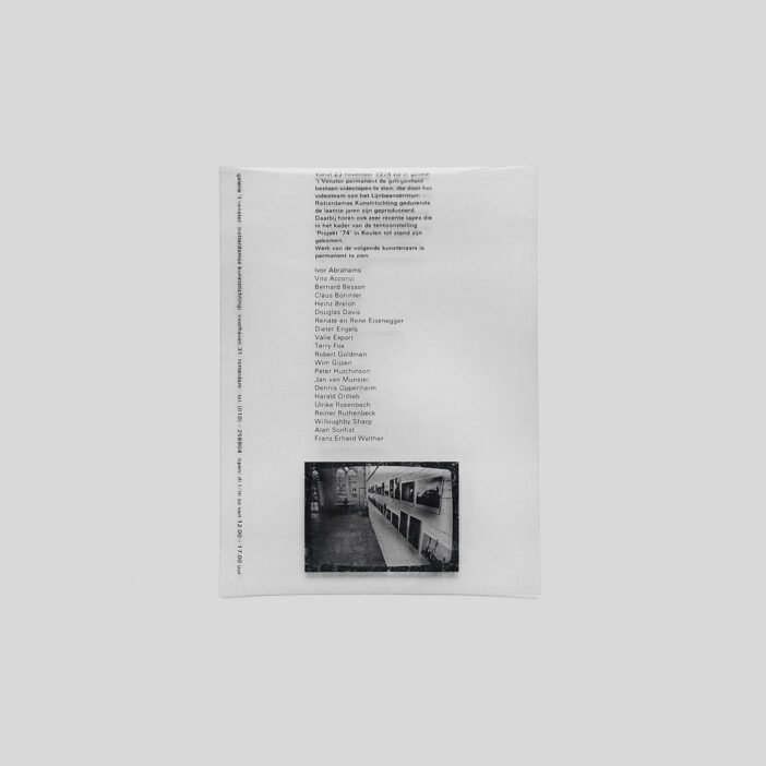 Venster permanent de gelegenheidt bestaan videotapes zien, die door het videoteam van het Lijnbaancentruns Rotierdamse Kunstrtichting gedurende de laatste jaren zijn geproduceerd. Daarbij horen ook zeer recente tapes die in het kader van de tentoonstelling Projekt 74 gekomen Keulen tot stand zijn